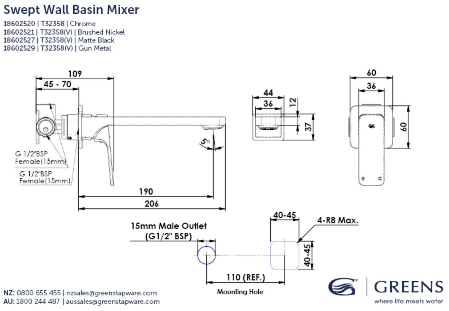 Greens Swept Wall Basin Mixer, Chrome, 18602520
