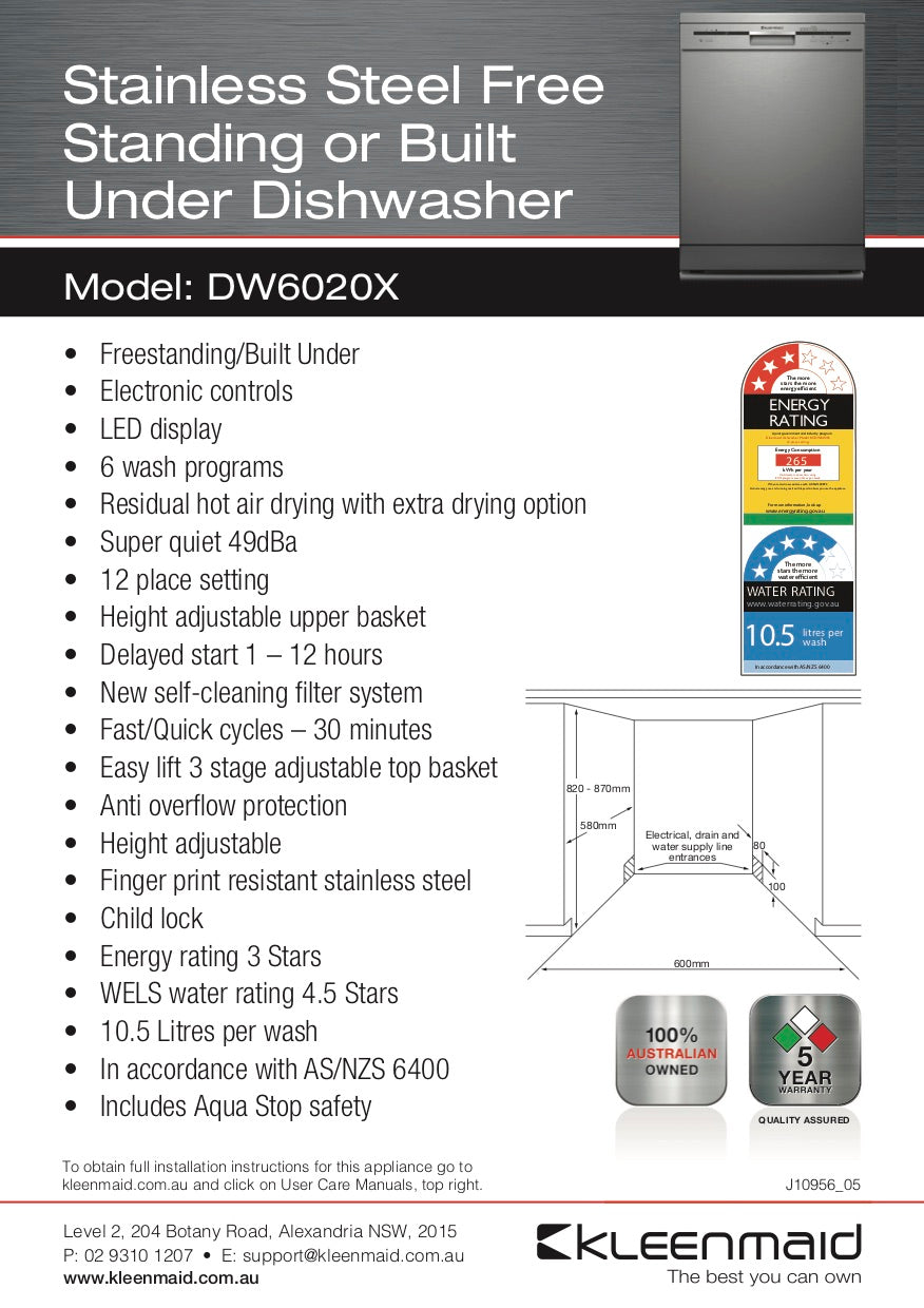 DW6020X is a super quiet, stainless steel, Free Standing or Built Under Dishwasher with LED display, self-cleaning filter system, height adjustable top basket and many other amazing functions. It also has a 5 year warranty.