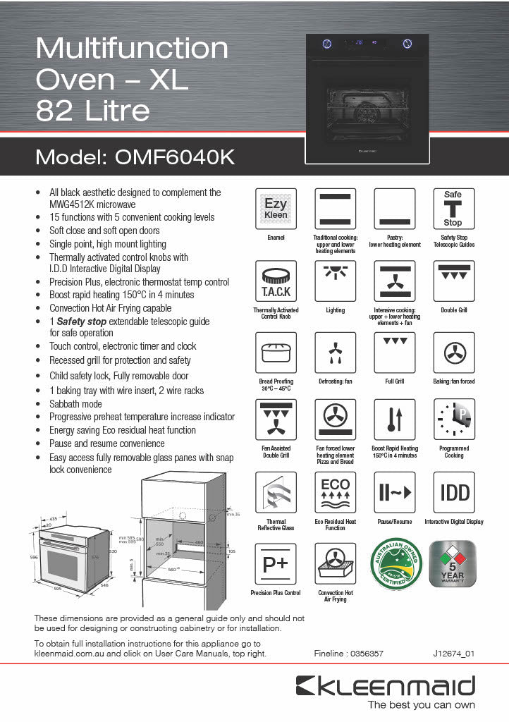 Peace of mind is guaranteed with extra safety features which include a child safety lock, a recessed grill, and one set of Safety Stop extendable telescopic shelf guides. Like all our ovens the OMF6040K incorporates Kleenmaid’s EzyKleen enamel making cleaning your oven a breeze, comes with a 5-year, full parts and labour warranty, and is supported by our highly skilled national service network.