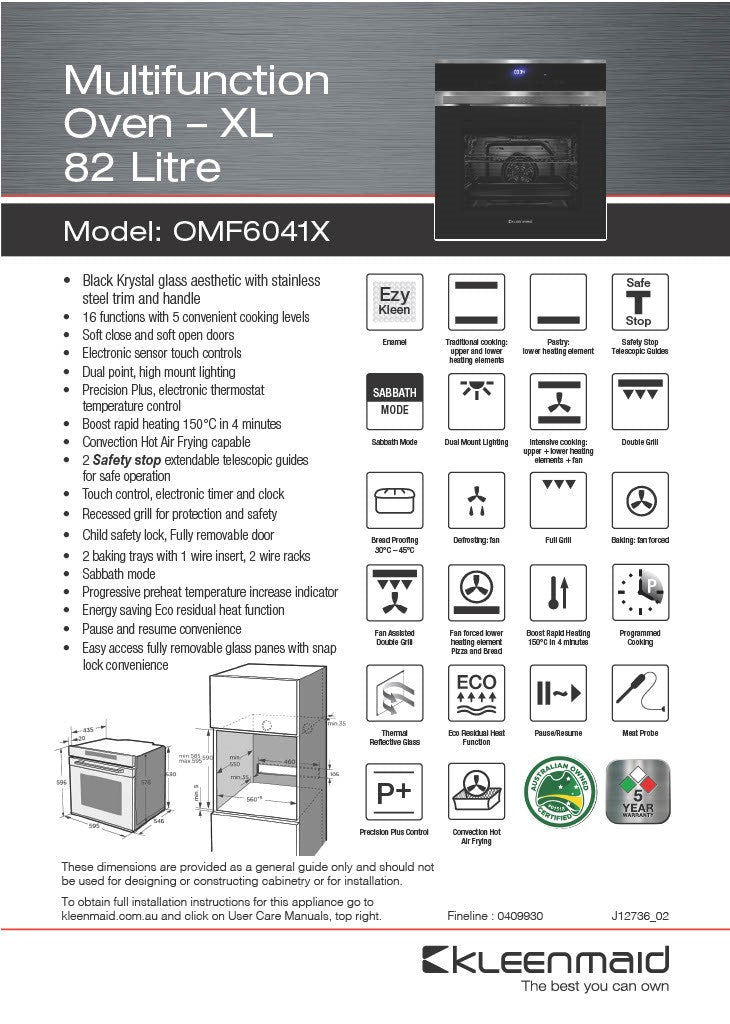 A premium, XL, 82 Litre, 60cm multifunction oven, the OMF6041X is superbly constructed from a combination of beautifully crafted brushed stainless steel and Kleenmaid’s distinctive Black Krystal glass. The features of the OMF6041X are amongst the world’s finest - whether you are catering for a dinner party or cooking the Sunday roast, you will love using this oven. This model operates by electronic sensor touch controls and has 16 functions including Pastry, Defrosting, Dough Proofing and a Meat Probe, combined with 5 convenient cooking levels making cooking easy, efficient and enjoyable.